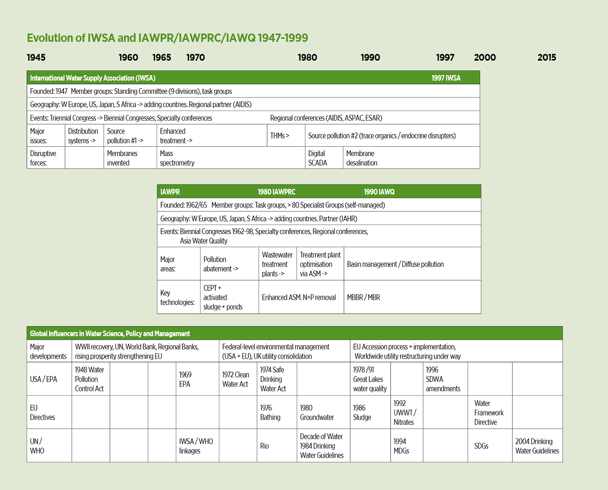 Both IWSA and IAWPR/IAWQ were formed in the aftermath of the Second World War – 15 years apart but, from today’s perspective, both very much of the same era. Both were international membership organisations aimed at promoting research and best practice through the power of international exchange. The initial development of the water supply industry had passed the invention stage of the first half of the 1900’s. Although treatment methodologies varied from one country to another, most advanced countries had implemented reliable solutions by the 1930’s, certainly in larger cities.