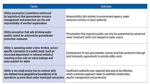 More generally it would appear that water utility managers and engineers are too often beset by day-to-day problems, and thus tend to look for operationally simple water supply arrangements (such as a single major source and a large treatment works), rather than to more secure and robust conjunctive solutions. An institutional diagnostic is beginning to provide indications of a number of potential reasons for this (Table B). These clearly range from fundamental misconceptions to real impediments imposed by the conditions of the operating concession and/or structural deficiencies in the water sector as a whole.