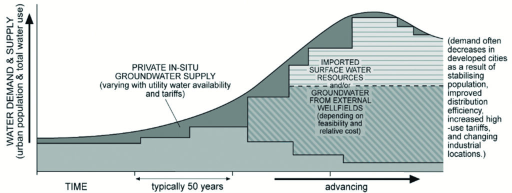 This diagram shows the relationship between investment in public water supply and the growth of private water use from groundwater. The timing of major sources of ‘imported water’ are significant features.