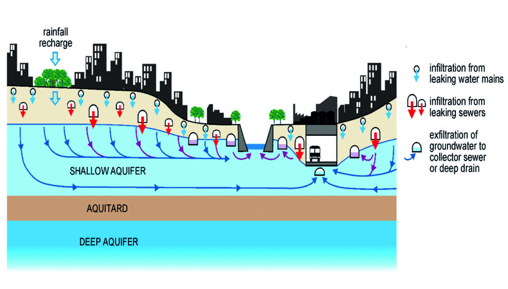 This diagram shows the complexity of interactions between groundwater and urban infrastructure and the importance of understanding the shallow groundwater flow regime to design deep subsurface infrastructure.