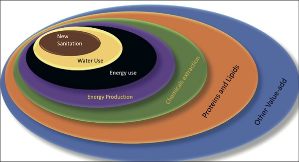Figure 1. Non-sewered sanitation has a high beneficiation potential. The use of waste slurries as organic fertilisers is well established. Waste also has high energy generation potential through biogas capture as well as liquid fuel. The extraction of high-value proteins, peptides and lipids are now emerging from the laboratory to complement the chemicals extraction that is already being industrialised.