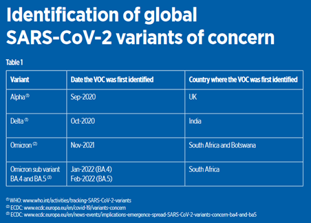 Since 2019, several variants of concern (VOC) have emerged, including different subvariants. A VOC is identified by the World Health Organization (WHO) and Centers for Disease Control and Prevention (CDC) as a variant that is more transmissible, spreading globally and/or causing more serious illness. Table 1 (below) shows the most common global variants and the date and location they were first observed.
