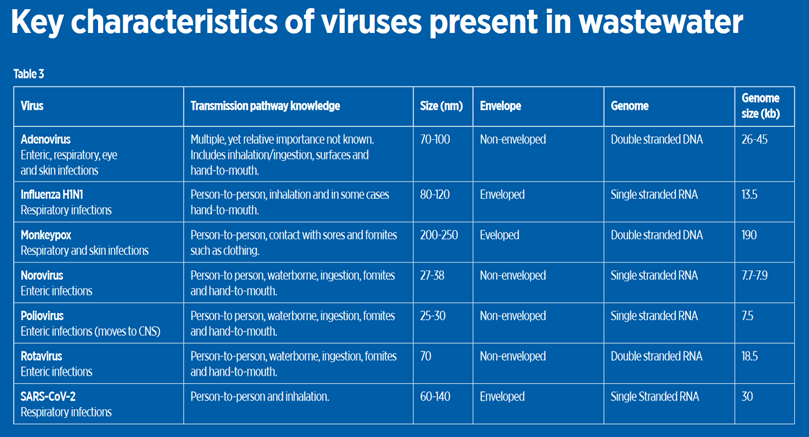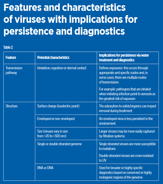 New technology and the rapid sharing of information make it possible now to answer these questions for any apparently new viral agent that may be detected in wastewater. Table 2 (over) summarises some key features of viruses that provide useful starting points, as these characteristics and the rapid information on the water microbiome and genomes of key pathogens in water allow for transformational knowledge on any new agent found in wastewater.